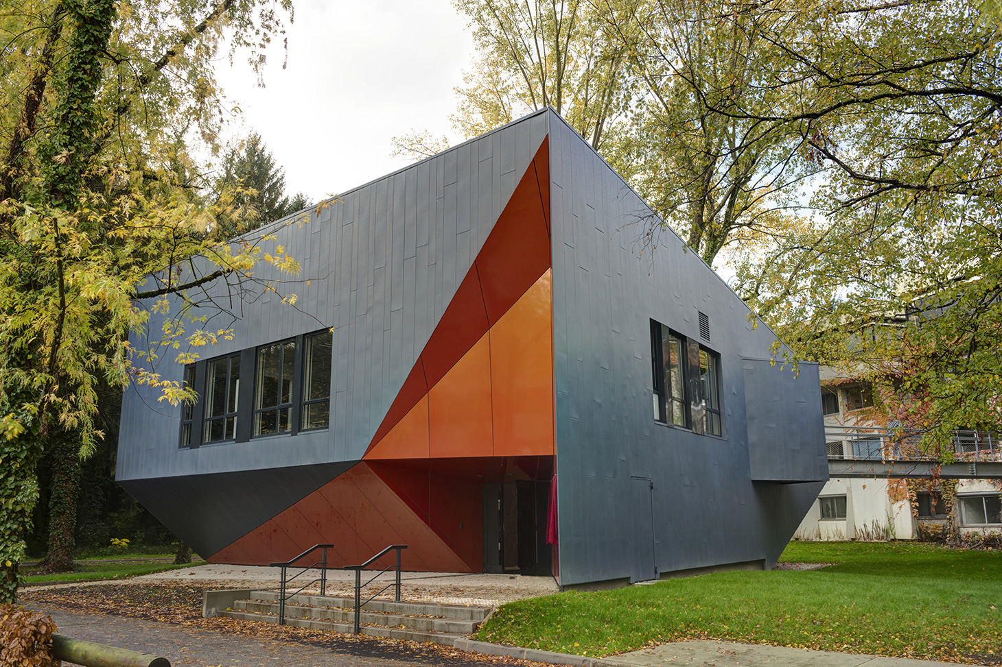 La géométrie facettée du bâtiment, relié par une passerelle au bâtiment principal d’ISTerre, compose deux portes à faux, l’un au-dessus de l’entrée principale sur la rue de la Météo et l’autre à l’arrière du bâtiment. Ces intentions plastiques sculptent le bâtiment, et répondent aux exigences thermiques et de compacité demandées par la maîtrise d’ouvrage. " Le projet architectural se compose d’un seul volume lisse et traduit l’idée d’un cristal posé dans un écrin de verdure." Le travail de composition des 7 façades du nouveau bâtiment participe à son intégration urbaine et paysagère et lui assure une identité propre et rayonnante au sein du campus.