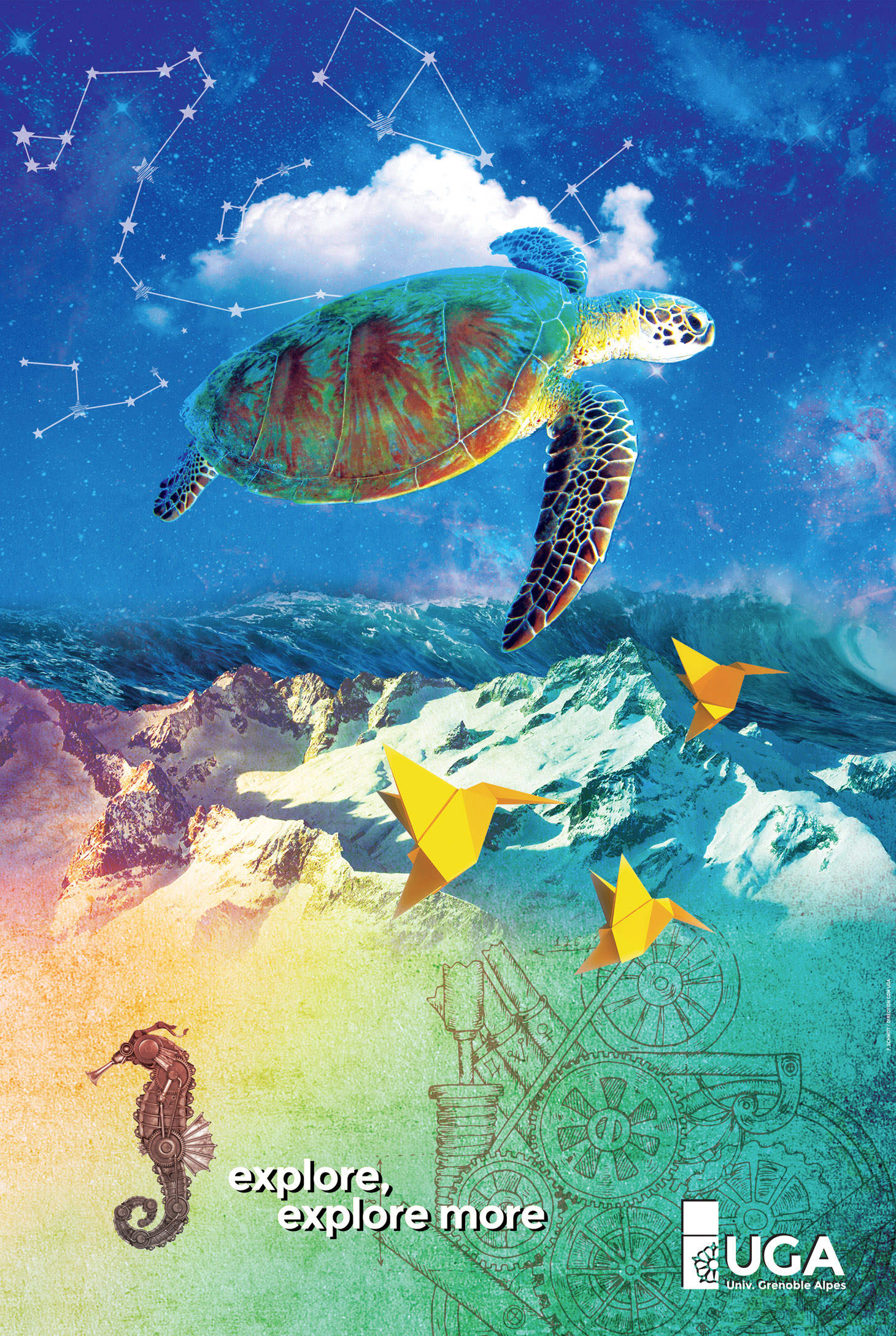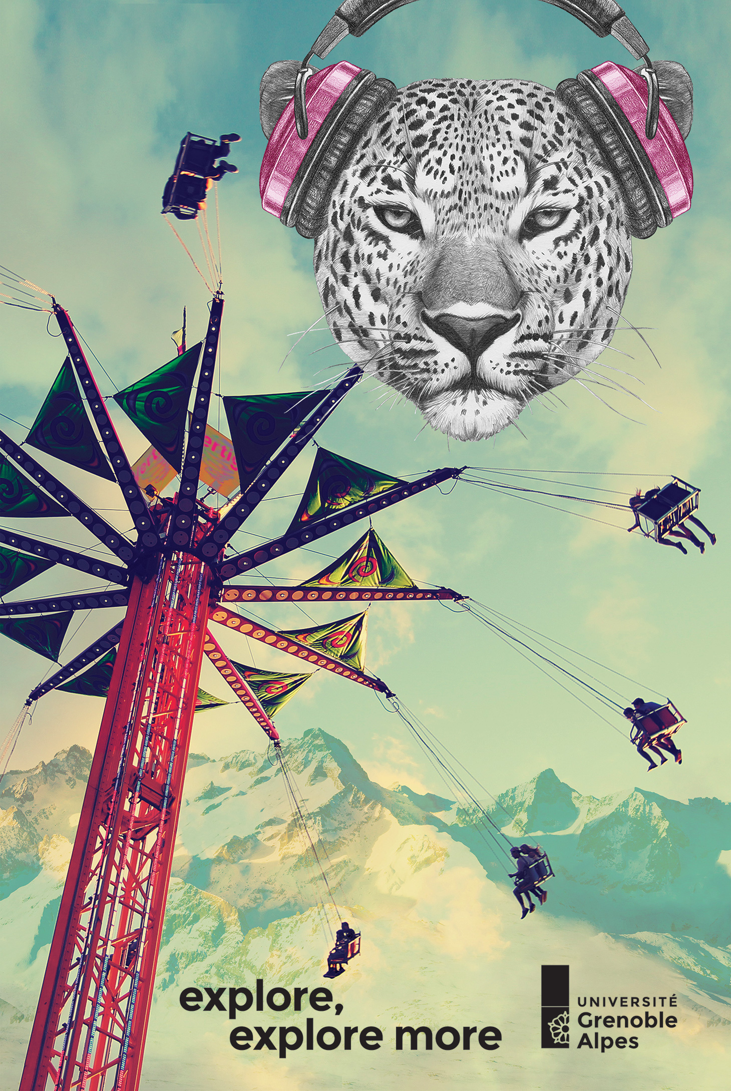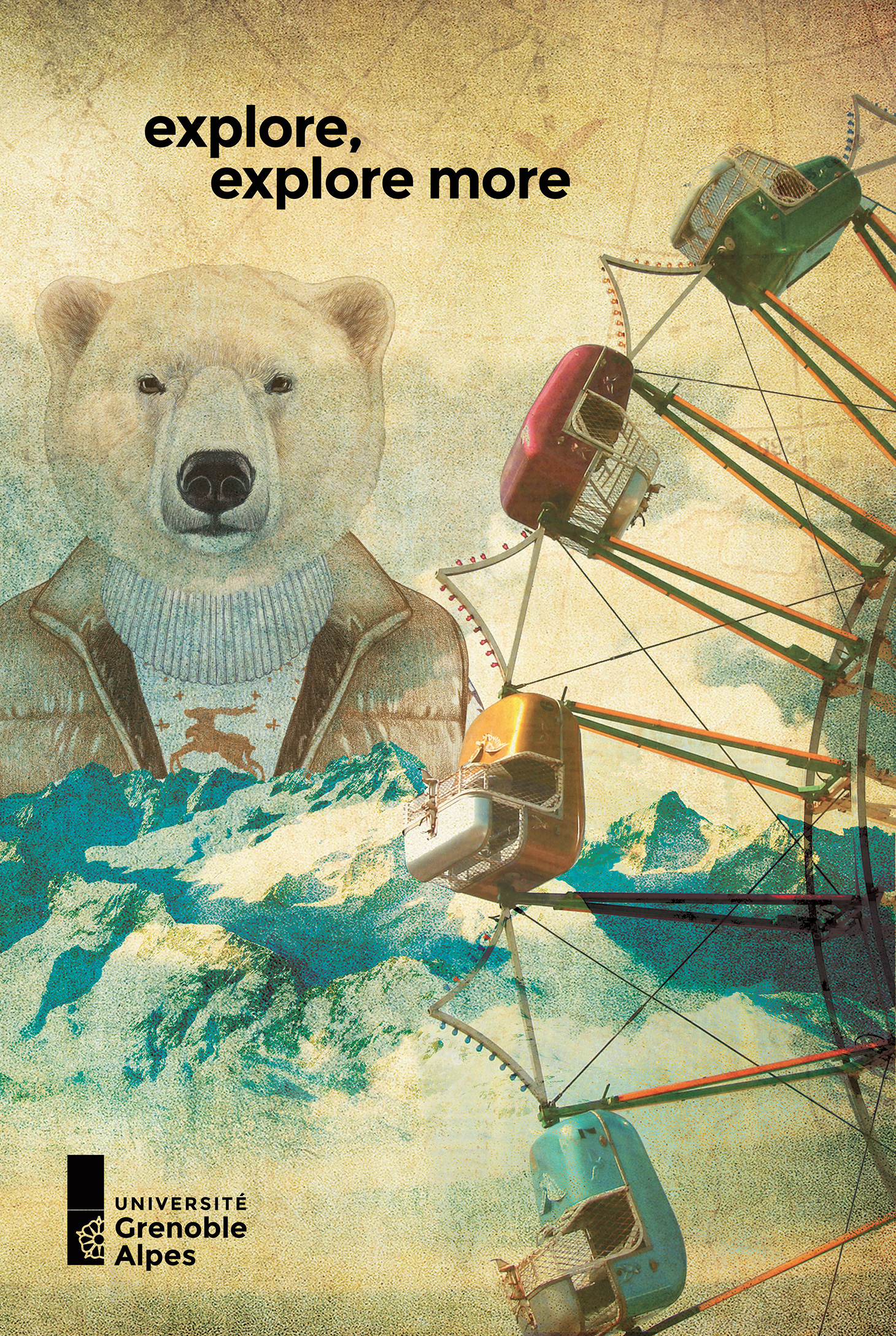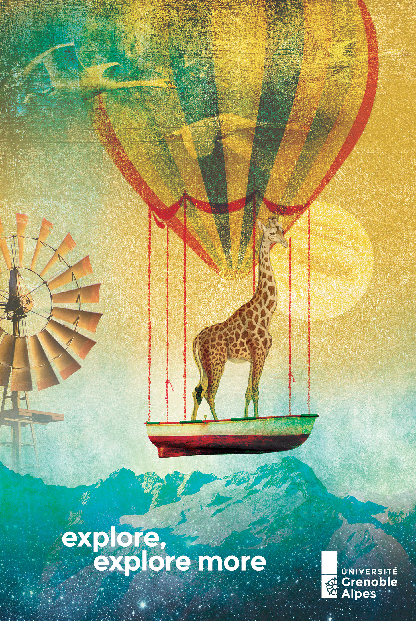 Réalisée en interne, cette invitation au voyage décline sur ses supports (affiches, vidéos, réseaux sociaux...) trois éléments essentiels, au cœur de l'identité de l'Université Grenoble Alpes :