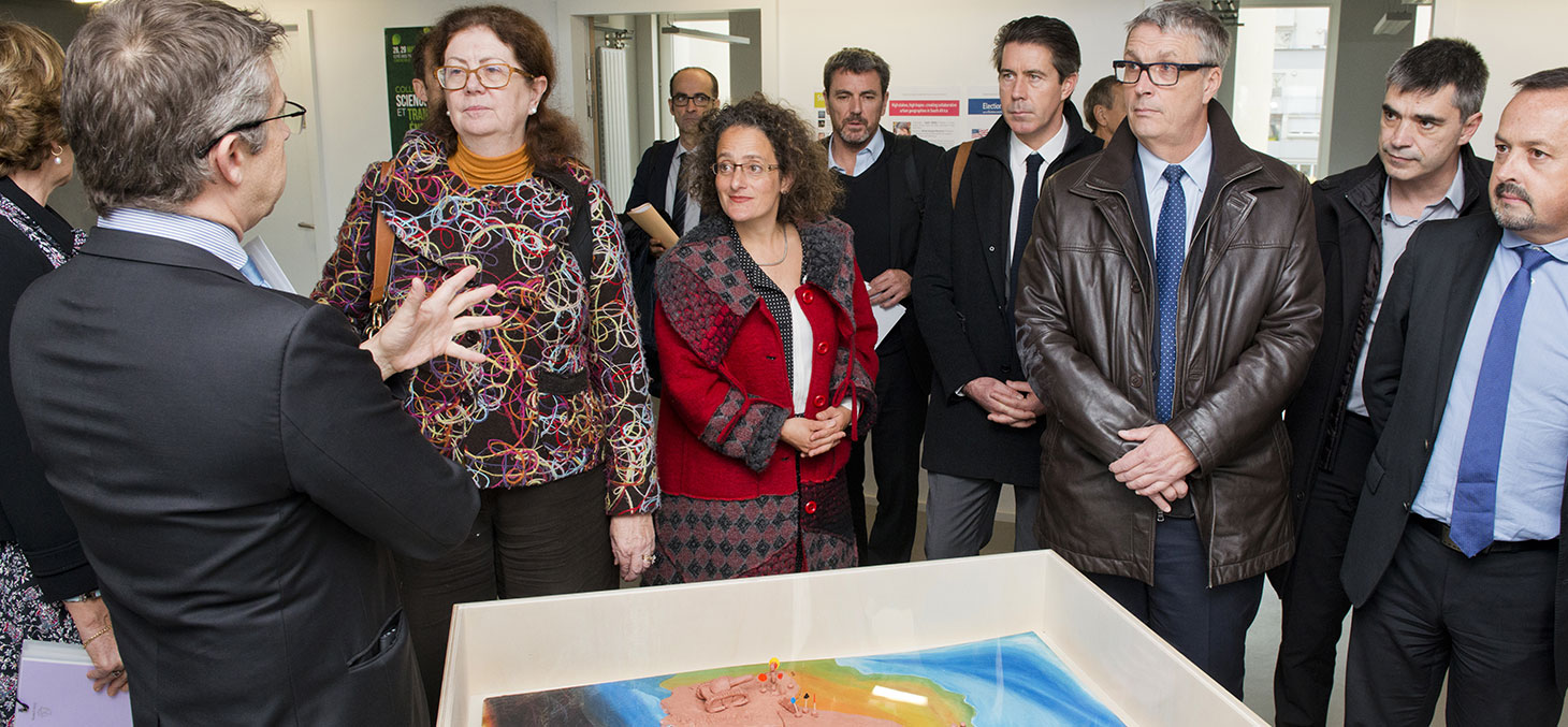 Suite de la visite : présentation des recherches du laboratoire PACTE par sa directrice Anne-Laure Amilhat Szary (en rouge) devant Lise Dumasy, Présidente de l’Université Grenoble Alpes, Jean-Pierre Barbier, Président du Département, Jérôme Vitre, Délégué régional du CNRS, Yannick Neuder, Vice-président du Conseil régional.