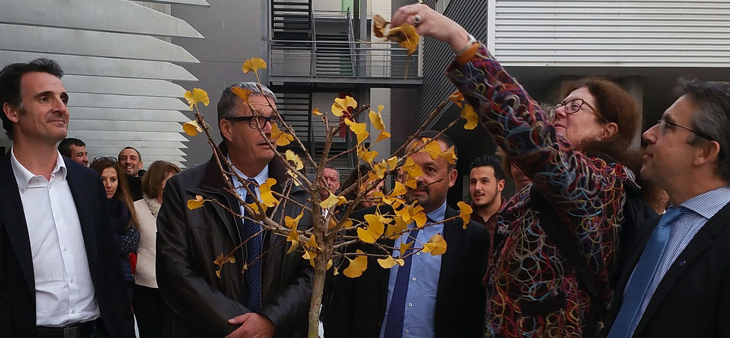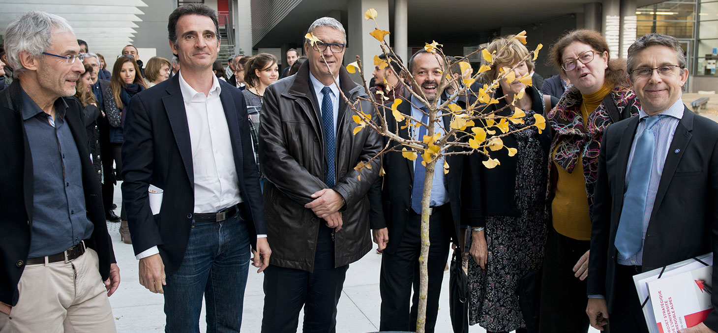 Les financeurs autour de l’arbre inaugural : Philippe Bourdeau, administrateur de l’Institut de Géographie Alpine, Eric Piolle, Jean-Pierre Barbier, Yannick Neuder, Claudine Schmidt-Lainé, recteur de l’académie de Grenoble, Lise Dumasy et Christophe Ferrari.