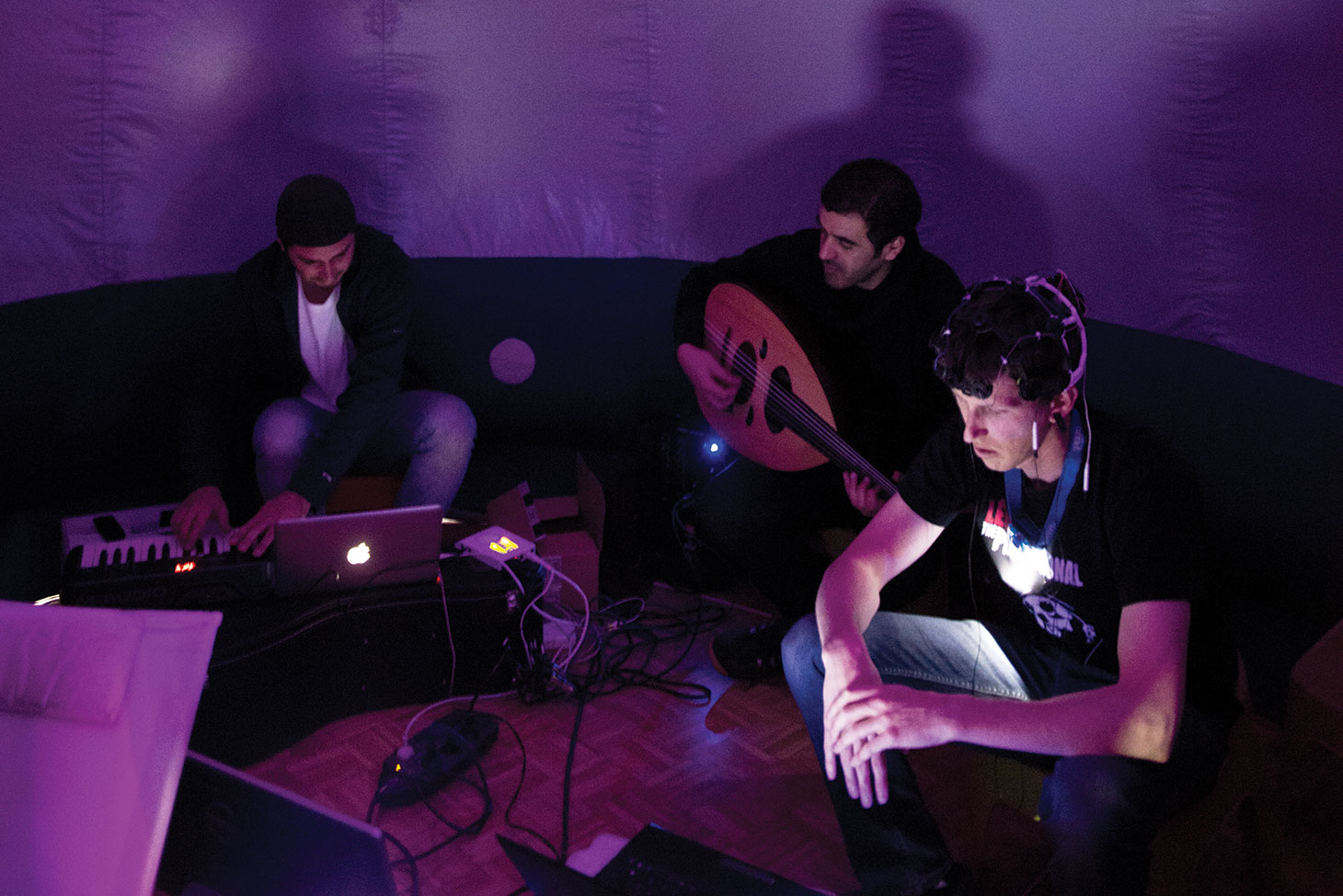 Le Cerveaurium en musique avec avec son concepteur Romain Grandchamp, chercheur postdoctorant au Laboratoirede Psychologie et NeuroCognition de Grenoble, Raphaël Bayle, musicien percussionniste et Rabah Hamrene, musicien multi-instrumentiste