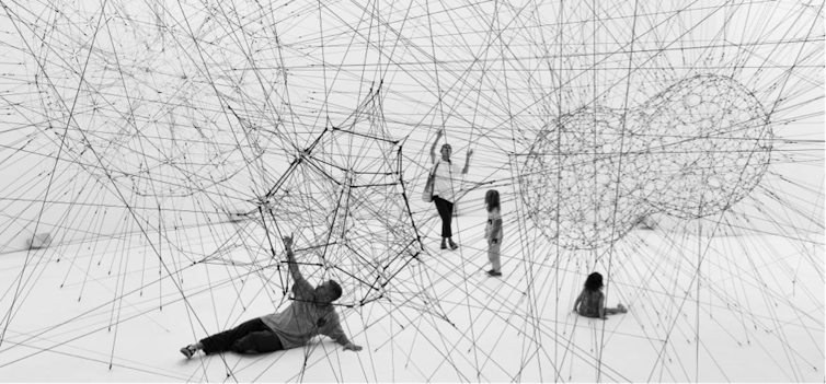 Le splendide isolement de leurs spécialistes bloque l’élan vers ce « hacking » de la connaissance que l’artiste appelle lorsqu’il évoque la « myriade d’autres possibilités de perception incarnées ». Lors des rencontres au Palais de Tokyo le 23 novembre 2018, j’ai cru entendre Tomas Saraceno demander à deux physiciens si les araignées dans leur toile pouvaient ressentir les ondes gravitationnelles. Il y avait dans cette question une certaine provocation et une petite dose d’ironie. Pauvres araignées, leur capacité de détection des vibrations de leur toile est incroyable mais… soyons clair : scientifiquement, la question n’a aucun sens. De plus, à trop bien ressentir, on risque de se noyer dans le bruit.