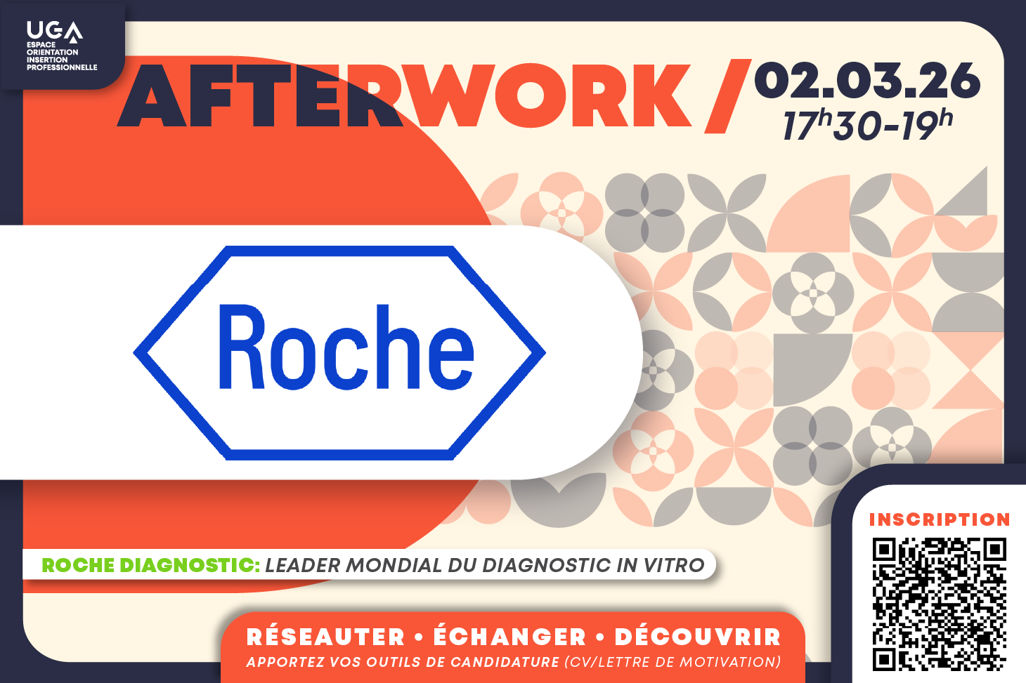 Une fois par mois, l’Espace orientation et insertion professionnelle de l’UGA vous propose de découvrir une entreprise du territoire et de commencer à créer votre réseau professionnel ! Prochain rendez-vous afterwork, venez rencontrer Roche Diagnostics.