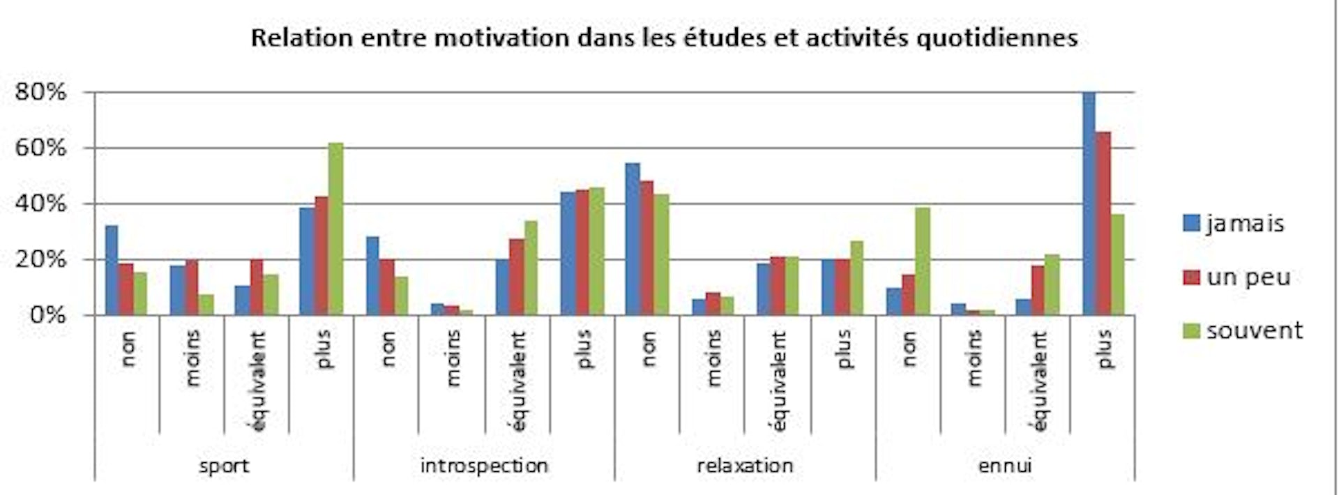 Les plus motivés ont fait du sport plus souvent qu’avant le confinement, contrairement aux non motivés. Si tous les étudiants qui ont répondu étaient plus souvent connectés qu’avant le confinement, les non motivés étaient beaucoup plus nombreux à le faire, et enfin, 80 % (contre 36 % des motivés) s’ennuyaient plus souvent qu’avant le confinement (notamment les étudiants en première et deuxième années).