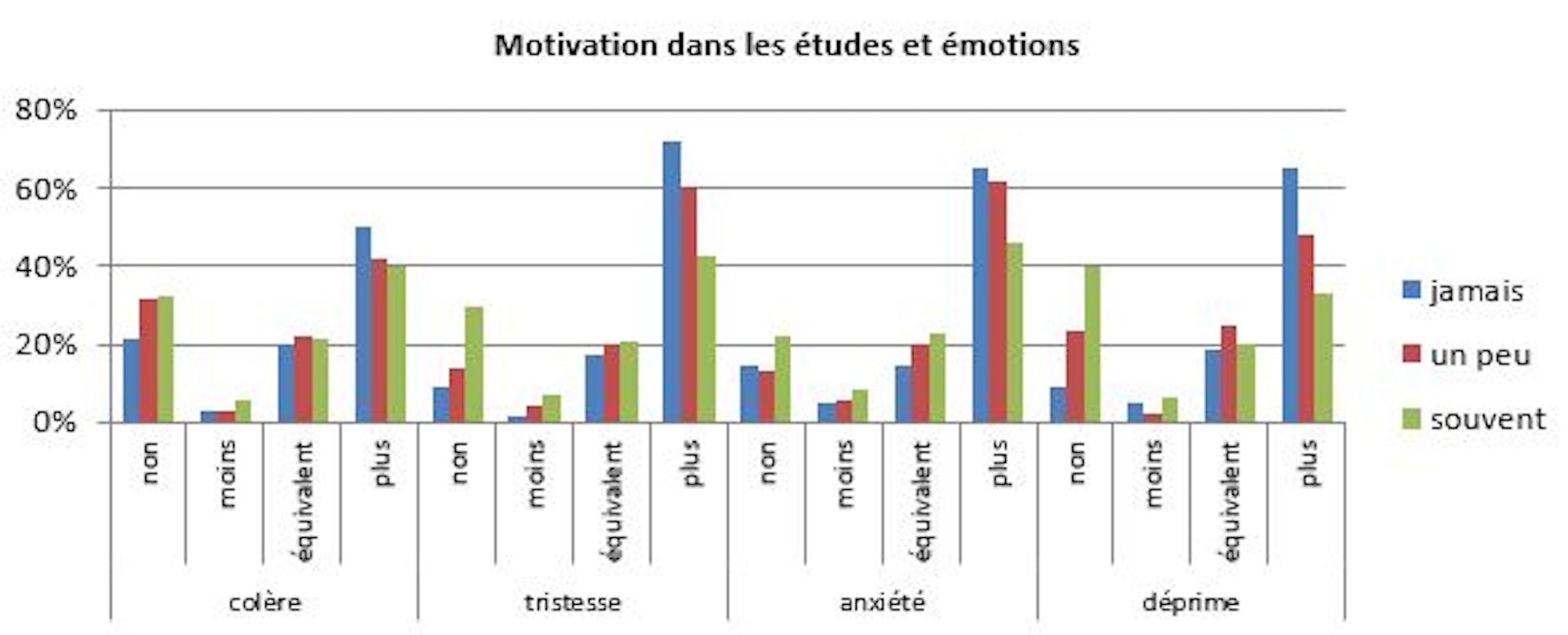 Ceux qui n’étaient pas motivés sont plus nombreux à s’être sentis plus anxieux dans cette période qu’avant le confinement (65 %) par rapport aux bien motivés (45 %) et à l’échantillon total (57 %). Idem pour le stress (67 % contre 52 % et 57 % respectivement). Idem pour le sentiment de colère avec cependant des effectifs observés un peu plus faibles. Qu’ils soient motivés ou non, l’anxiété portait sur la peur de la contamination (ses proches ou les personnes les plus fragiles, moins pour eux-mêmes), la peur de l’échec (stress par rapport aux examens à distance) ou la peur de l’avenir professionnel (peur de la dévalorisation du diplôme, peur de ne pas trouver de stages).