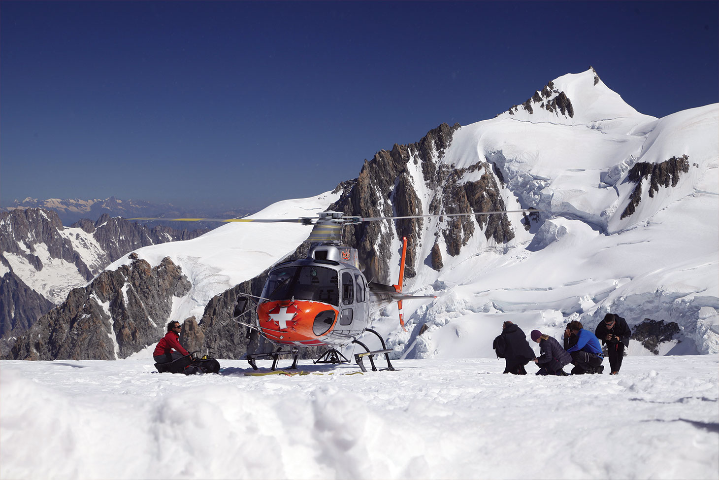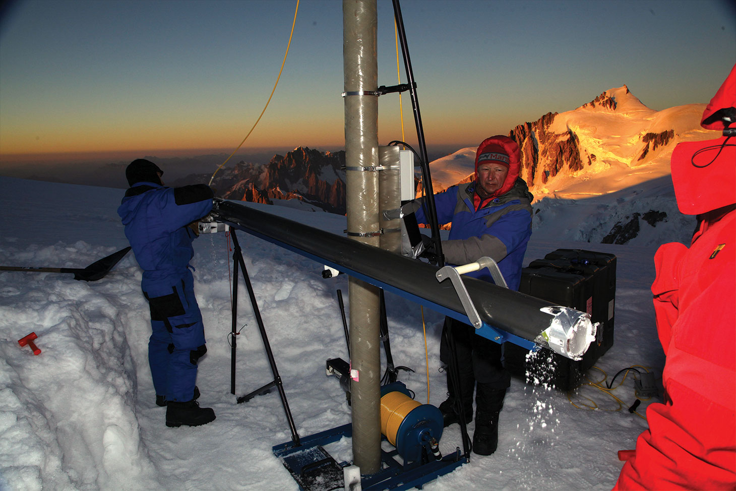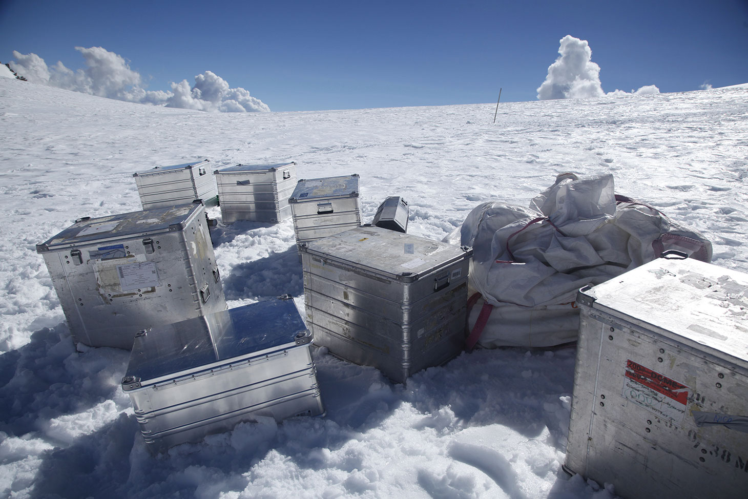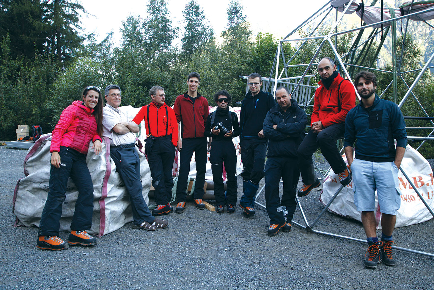 L’équipe d’ Ice Memory attend l’hélicoptère qui va emporter la structure du dôme de forage sur le Mont-Blanc.
