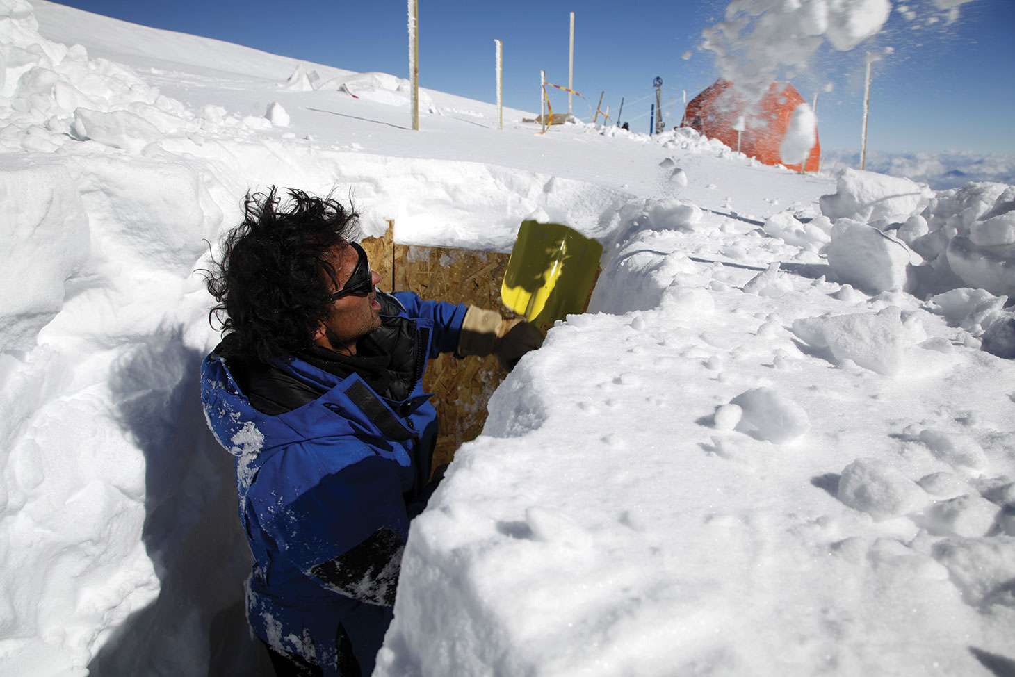 Bruno Jourdain creuse une tranchée pour le stockage des caisses de carottes de glace. Il restera là-haut au col du Dôme tout le temps de la mission.