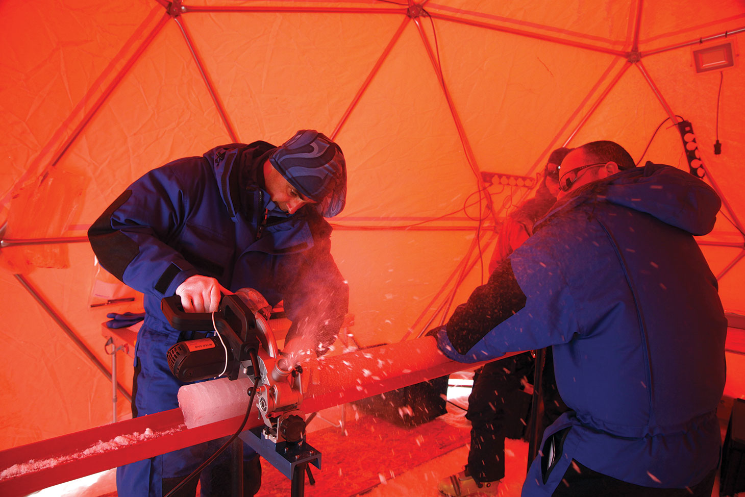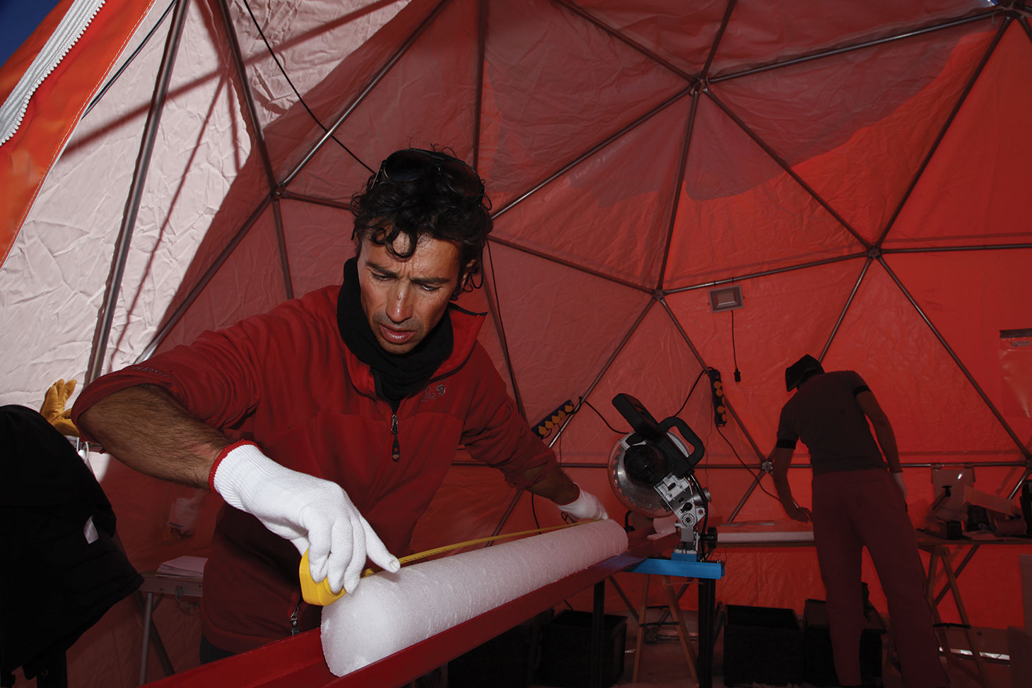 Patrick Ginot, le responsable de l’expédition, coupe la carotte de glace fraîchement prélevée.