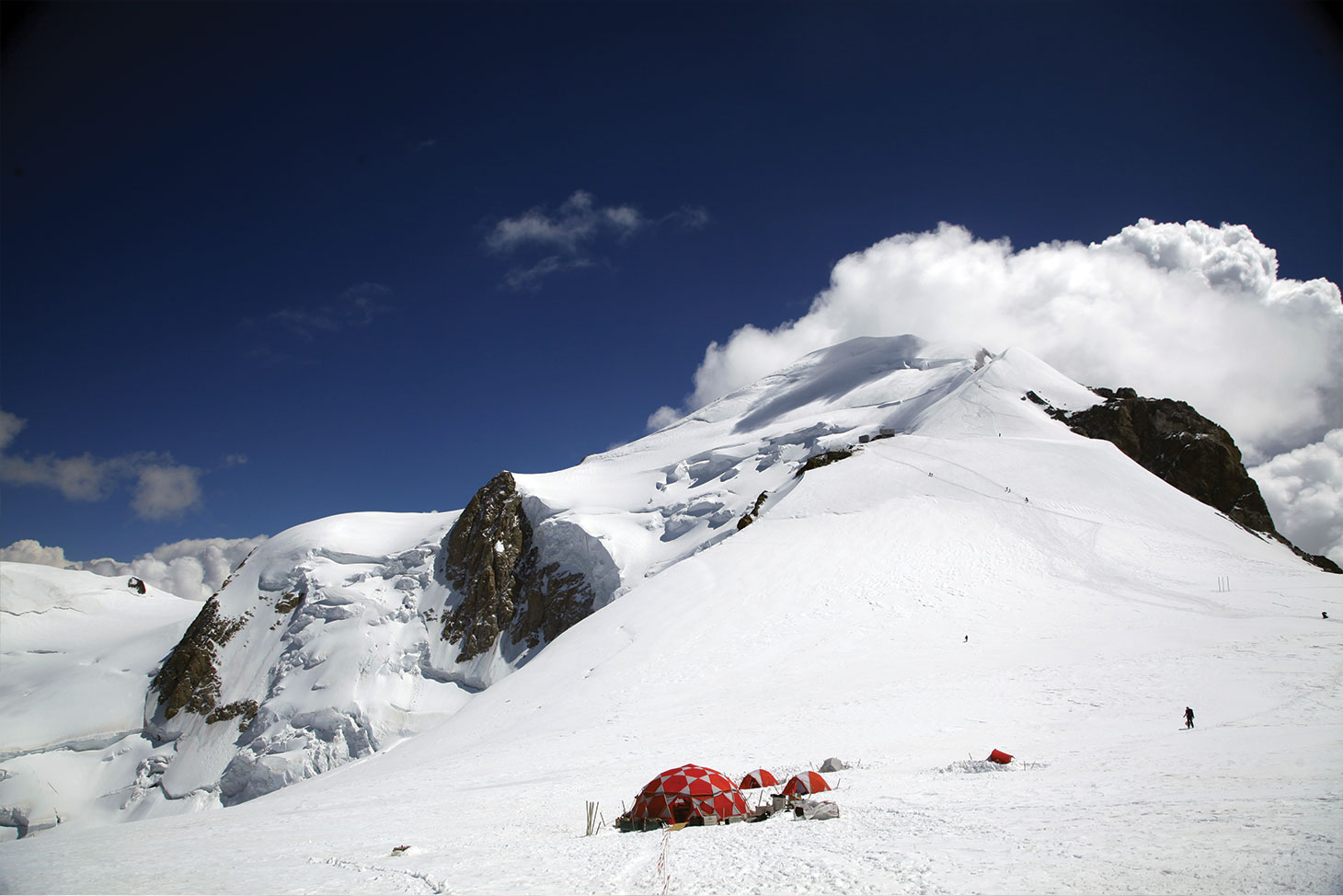 Vue de jour du camp de vie et du site de forage au col du Dôme.