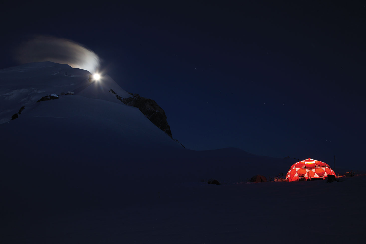 Vue de nuit du camp de vie et du site de forage à quelques centaines de mètres du sommet du mont Blanc.