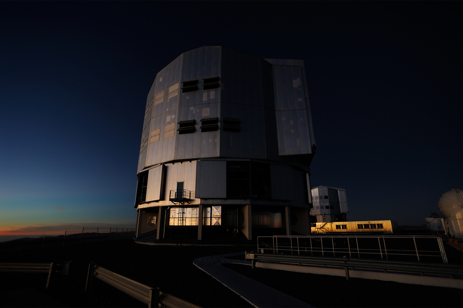 1. La plate-forme au sommet de la montagne accueille les 4 télescopes principaux ainsi que 4 télescopes auxiliaires de 1,8 m dont la lumière est recombinée grâce à l’interféromètre VLTI. 3 & 4. Travail de jour sur les instruments du VLT et travail de nuit dans la salle de contrôle. 5 & 6. L’hôtel hébergeant les personnes travaillant sur le site est situé à 2400 m d’altitude et est majoritairement enterré. Il doit évoquer des souvenirs pour les amateurs de James Bond ayant vu Quantum of Solace. 7. À la nuit tombante, le VLT est prêt à observer. 8 & 9. L'interféromètre Alma. 10 & 11. L'observatoire de la Silla. 12. Le Cerro Armazones proche du Cerro Paranal, site du nouveau projet de l'ESO.