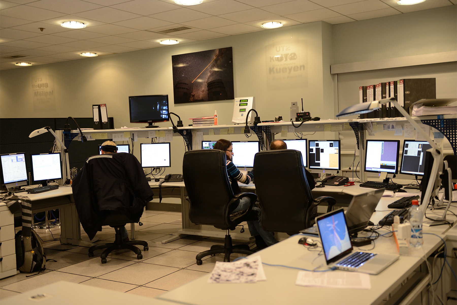 1. La plate-forme au sommet de la montagne accueille les 4 télescopes principaux ainsi que 4 télescopes auxiliaires de 1,8 m dont la lumière est recombinée grâce à l’interféromètre VLTI. 3 & 4. Travail de jour sur les instruments du VLT et travail de nuit dans la salle de contrôle. 5 & 6. L’hôtel hébergeant les personnes travaillant sur le site est situé à 2400 m d’altitude et est majoritairement enterré. Il doit évoquer des souvenirs pour les amateurs de James Bond ayant vu Quantum of Solace. 7. À la nuit tombante, le VLT est prêt à observer. 8 & 9. L'interféromètre Alma. 10 & 11. L'observatoire de la Silla. 12. Le Cerro Armazones proche du Cerro Paranal, site du nouveau projet de l'ESO.