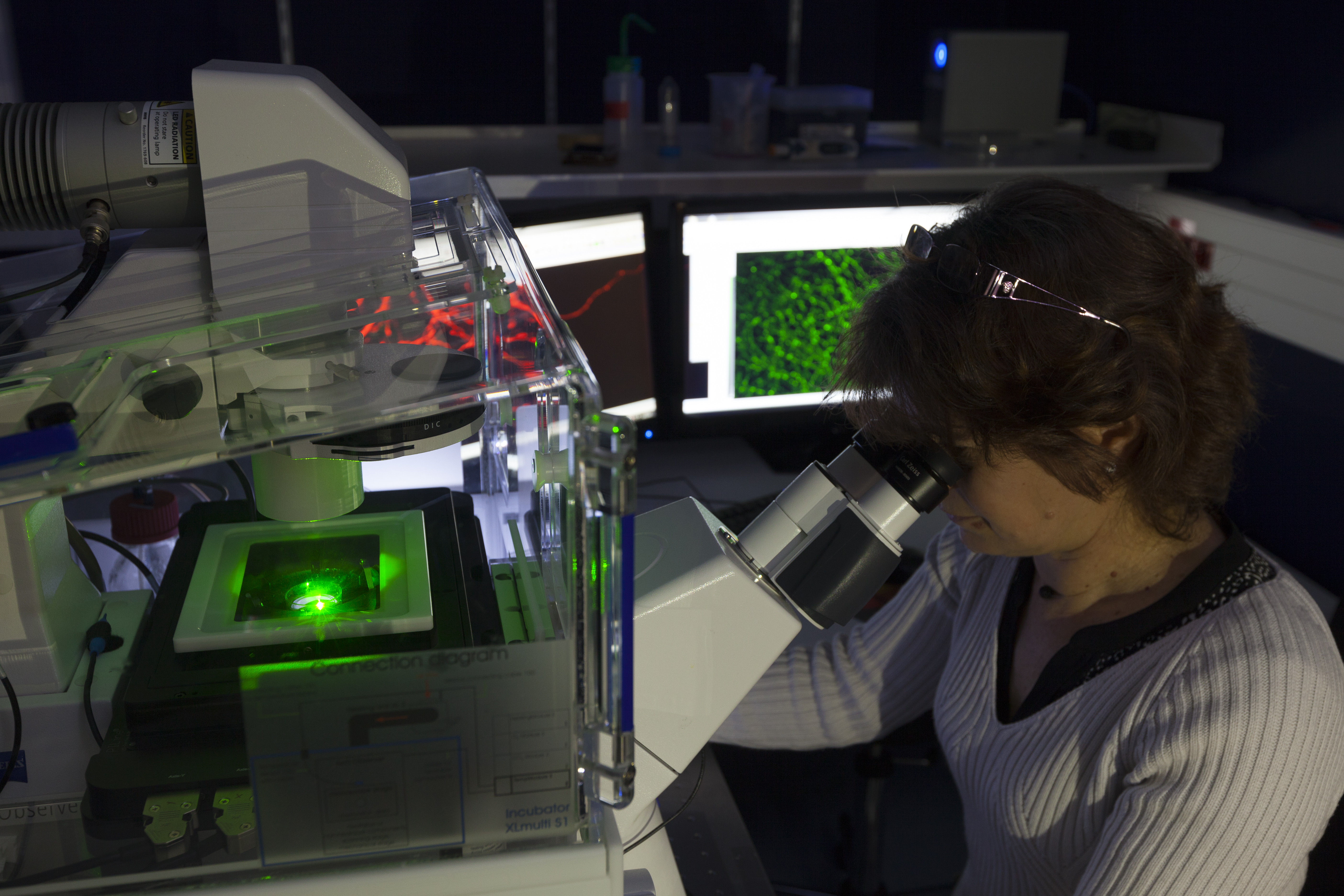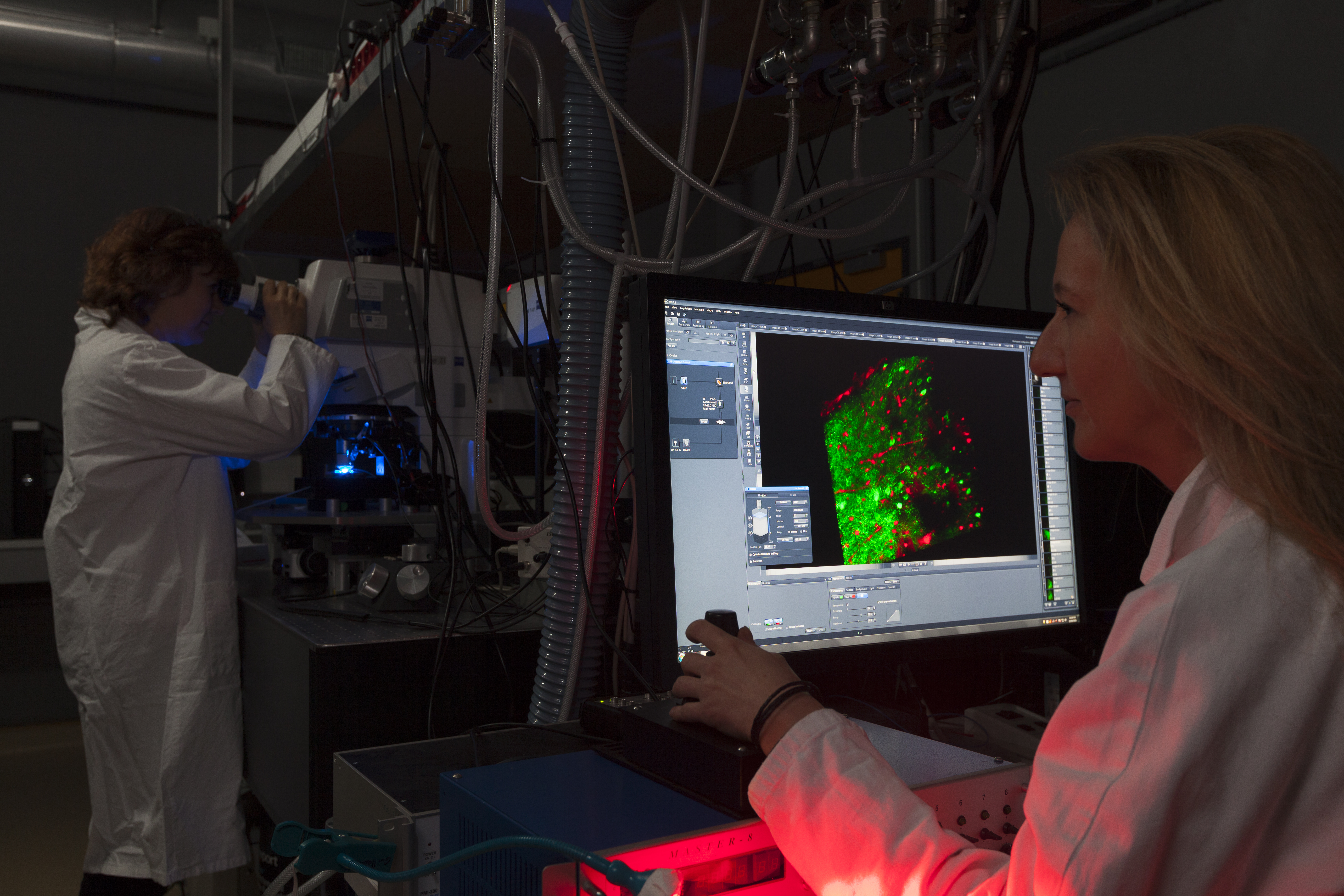 Inaugurée fin 2016, PIC-GIN, la Plateforme d’Imagerie Cellulaire du Grenoble Institut des Neurosciences réunit un ensemble d’équipements et de compétences permettant l’étude d’objets biologiques à différentes échelles. Avec la microscopie en fluorescence, les chercheurs peuvent y analyser des organismes entiers, des tissus sains ou pathologiques, des organites, des cellules ou même des molécules, jusqu’à une résolution de quelques dizaines de nanomètres. Les équipements de la plateforme PIC-GIN sont mis à disposition de la communauté scientifique et des industriels.