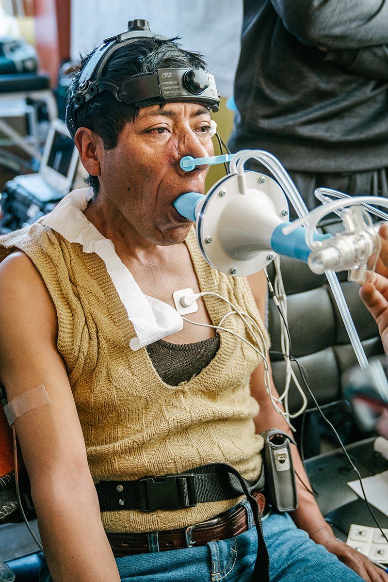 réaliser des mesures hémorhéologiques (viscosité sanguine, anatomie des globules rouges), des auscultations pulmonaires, des échographies cardiaques et une évaluation des perturbations du sommeil (apnée). De précieuses données ont ainsi été recueillies pour la première fois sur cette population vivant en permanence à une altitude où le taux d’oxygène est deux fois moindre qu’au niveau de la mer.