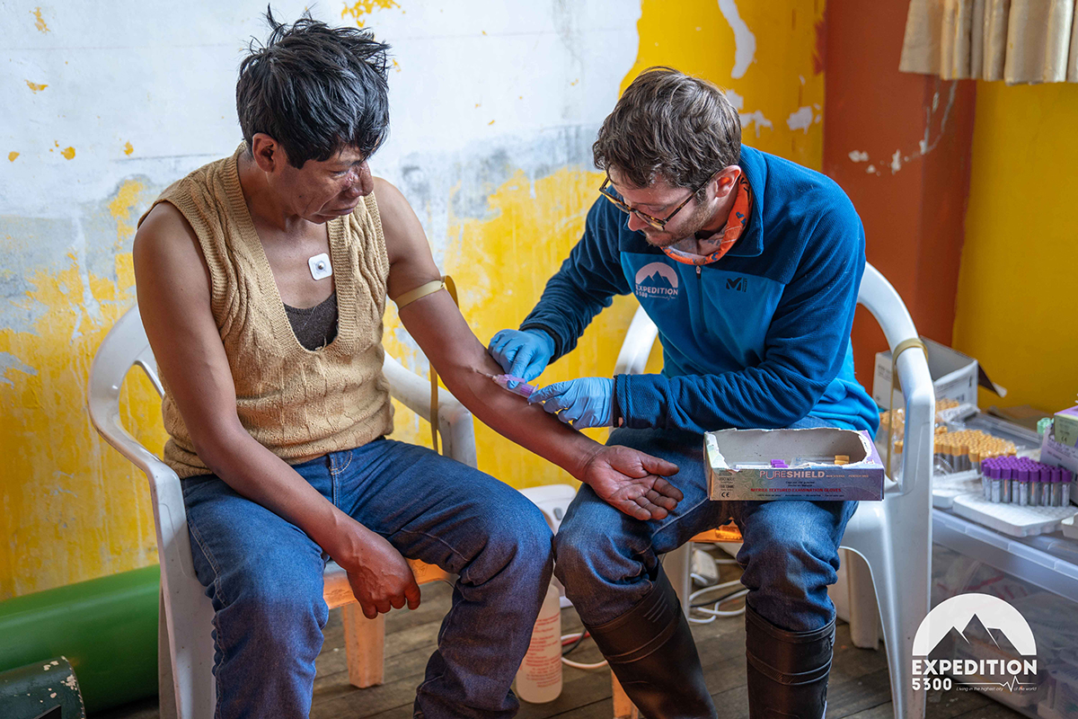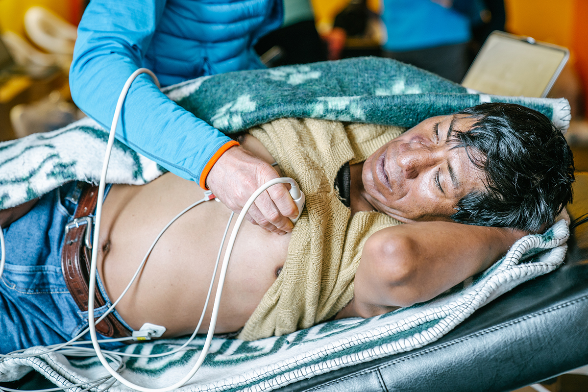 - 5, 6 & 7. Émeric Stauffer, médecin spécialiste du sommeil prélève du sang à un habitant de la Rinconada, avant qu’il ne subisse une échographie du coeur. Les premières analyses sont réalisées sur place. © Tom Bouyer - Expedition 5300