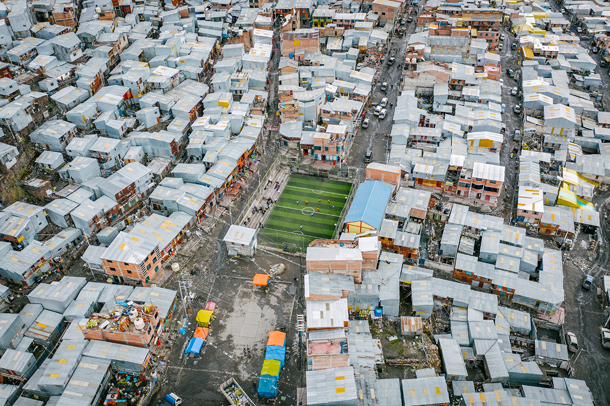 La Rinconada, construite à flanc de montagne a connu un développement important mais anarchique. Sa population a doublé, en 20 ans, grâce à une économie basée principalement sur l’exploitation de mines d’or. Mais malgré l’essor aurifère, aujourd’hui, la ville ne dispose toujours pas d’eau courante, ni d’égouts, ni de collecte des déchets. Pour autant, même à cette altitude, les commerces sont bien achalandés et les habitants comme ailleurs, jouent au football.