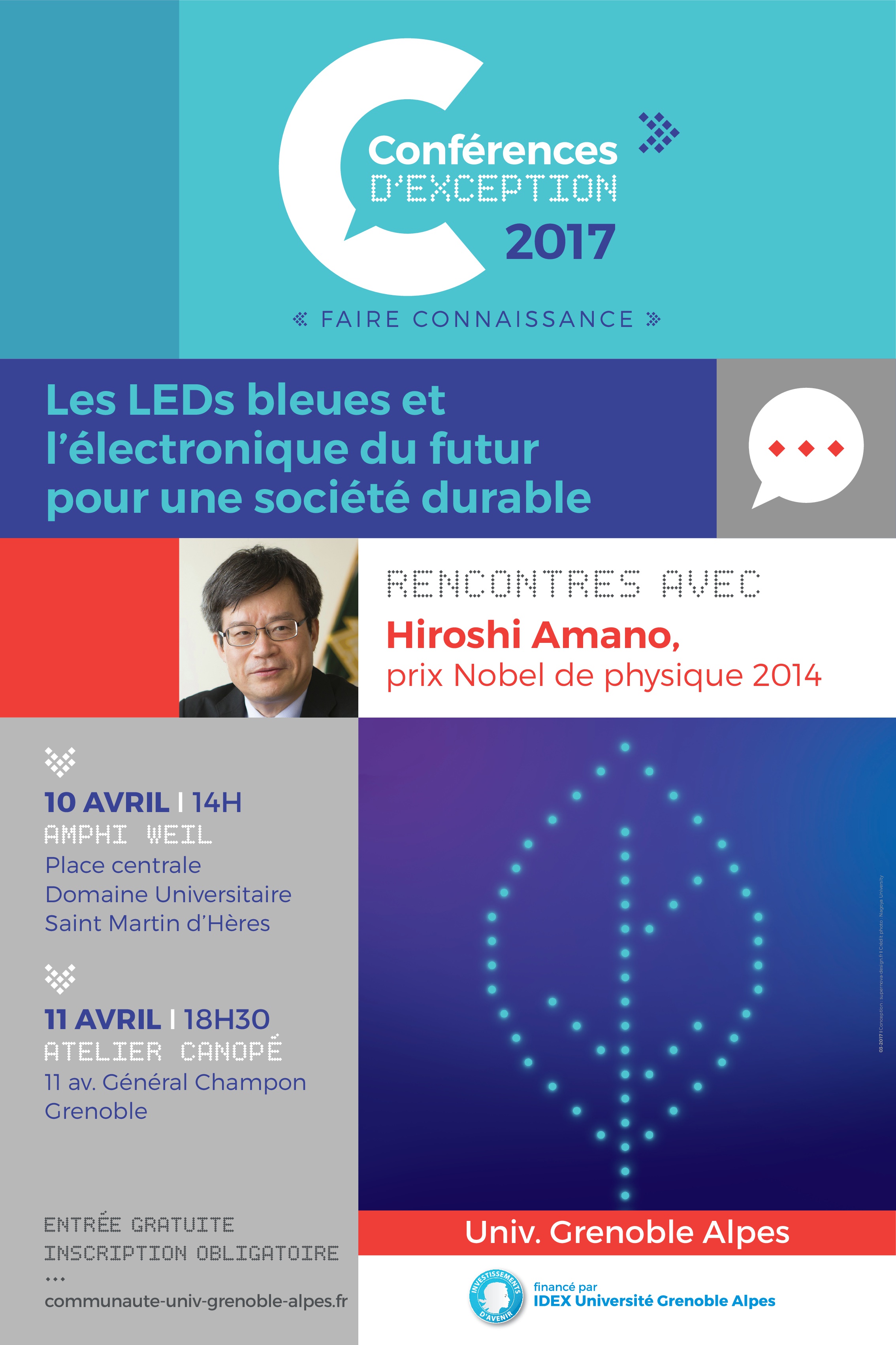 Hirosi Amano, prix Nobel de physique 2014, présentera l’état actuel de la compréhension des semi-conducteurs de nitrure en insistant sur les problèmes à résoudre ainsi que les perspectives de leur application futur.
