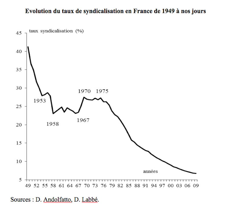 Or, dans le cas français, les syndicats paraissent vidés de leur substance. Ils ont perdu la majeure partie de leurs adhérents. Différentes enquêtes de l’Insee et, surtout, deux études approfondies sur la syndicalisation ont permis de retracer l’évolution de la syndicalisation depuis l’après-guerre. Selon une synthèse du ministère du Travail, ces recherches « ont permis d’établir les séries de référence » concernant l’évolution des effectifs syndiqués.