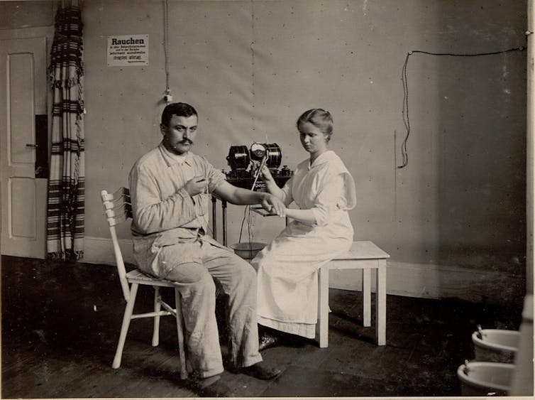 La Première Guerre mondiale vit aussi se répandre l’utilisation de la "faradisation", c’est-à-dire l’application d’un courant électrique, notamment pour traiter les symptômes somatiques, tels que les tremblements, ce qui traduit bien le fait que l’origine psychique des troubles n’était pas clairement établie pour tous.
