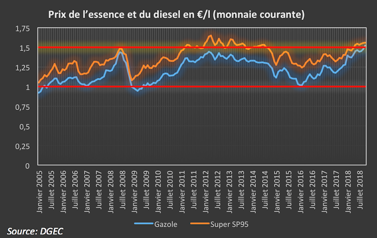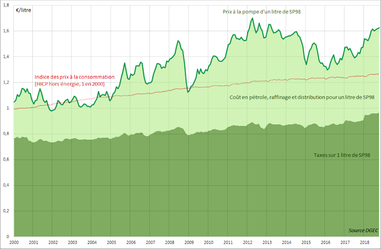 Seulement un tiers de cette hausse s’explique par la hausse des taxes pour ces différents produits pétroliers. Le chiffre est plus élevé pour le diesel, presque 40 %, du fait de la convergence des taxes diesel et essence initiée en 2017. Le reste provient de l’augmentation du prix du baril de pétrole, passé entre octobre 2017 et 2018 de 47 € à presque 68 € et, plus marginalement, des coûts de distribution.