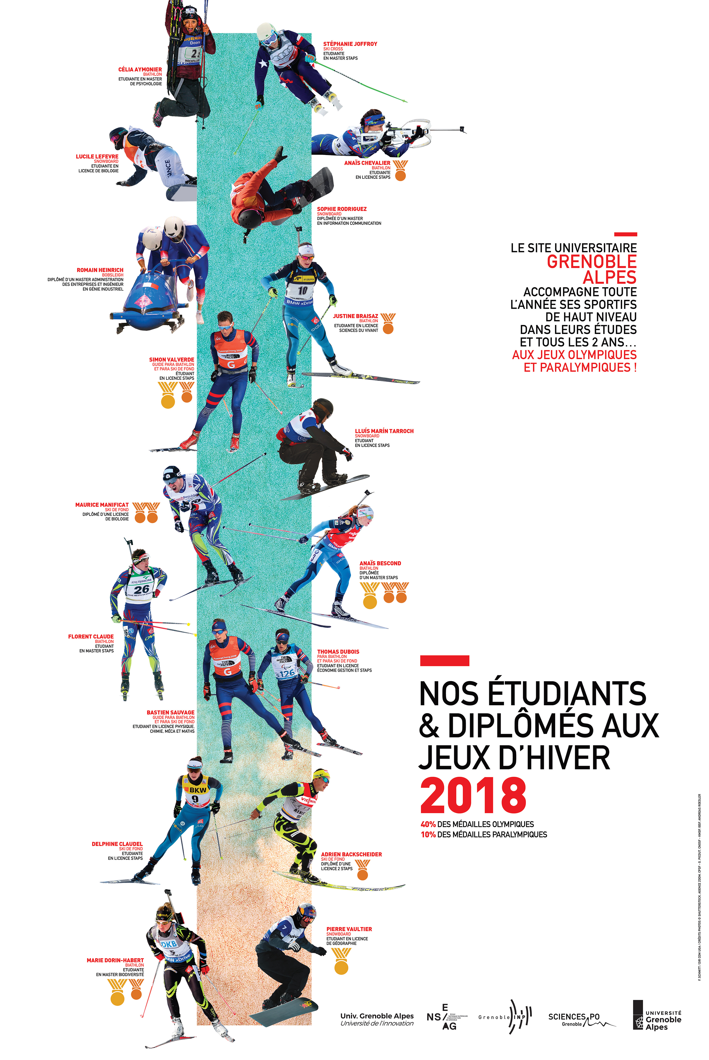 Du 9 au 25 février 2018, 10 étudiants et 5 jeunes diplômés de l’Université Grenoble Alpes ont participé aux Jeux olympiques d’hiver en Corée du Sud. Etudiants ou diplômés en géographie, en biologie moléculaire, en biodiversité ou encore en STAPS, sept d’entre eux ont décroché une médaille olympique : 2 en or et 4 en bronze, soit 40% des médailles de la délégation française. A noter l’exploit de Pierre Vaultier, le "snowboarder géographe", qui décroche un nouveau titre olympique quatre ans après Sotchi.